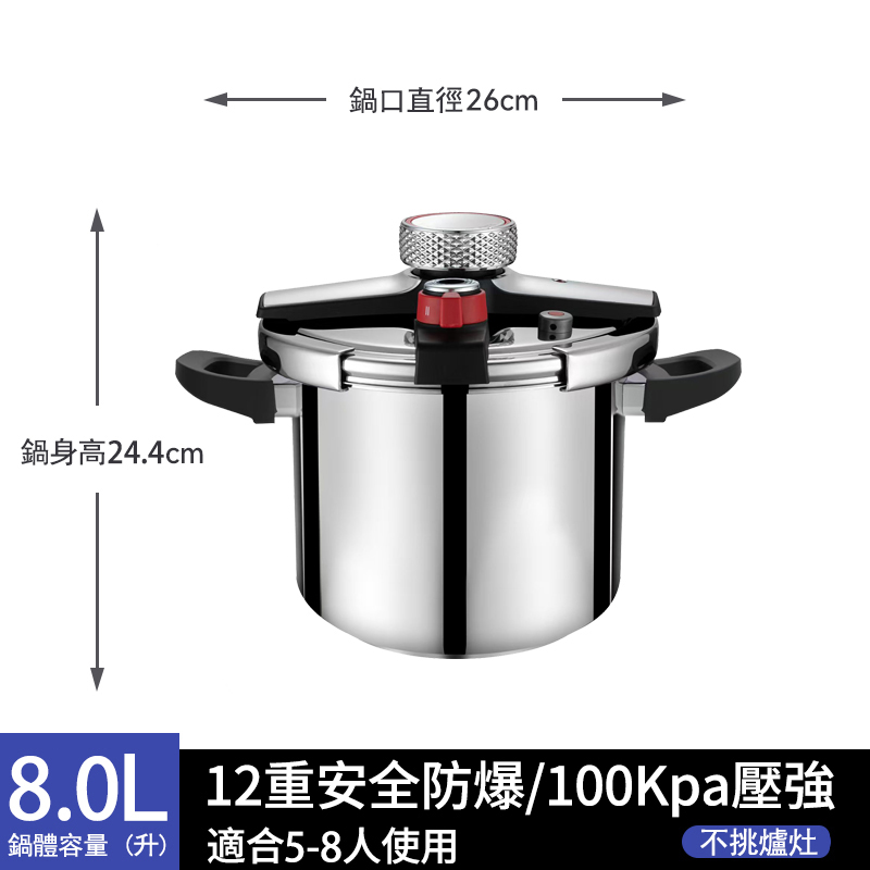 半小時前【2025年開春季】燃氣電磁爐通用【德國進口】304不鏽鋼壓力鍋 煮飯/熬粥/炖肉 自動限壓閥排氣保護安全防爆 耐用20年不壞 不滿意包退換 - 升級加厚 8L【適合5-8人使用】304不鏽鋼壓力鍋