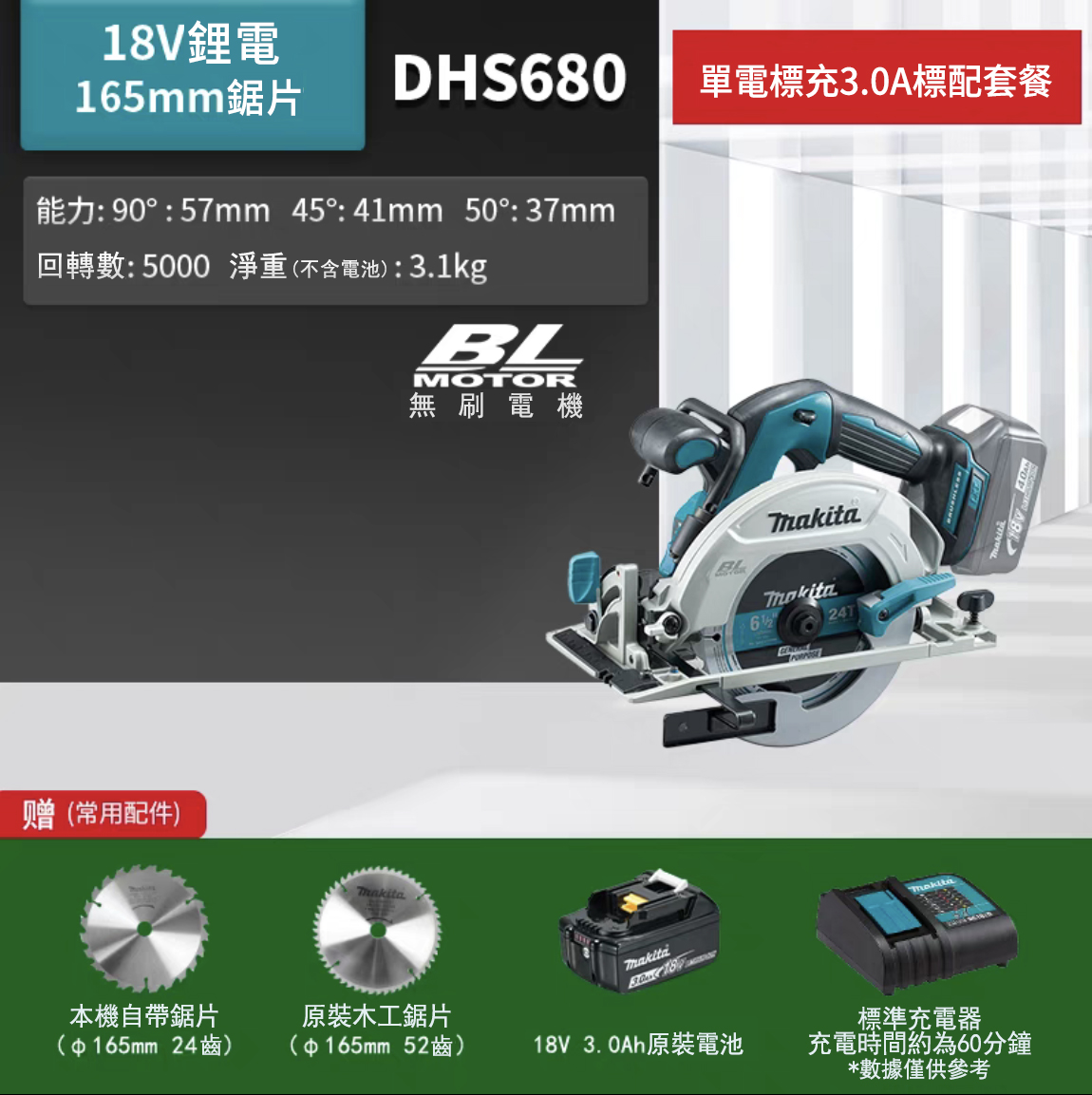 半小時前「牧田/Makita」DHS680 18V 4寸、7寸 多功能鋰電園鋸 大容量鋰電池 馬力強勁切割不卡殼 - DHS680【7寸】單電3.0Ah電池+兩鋸片
