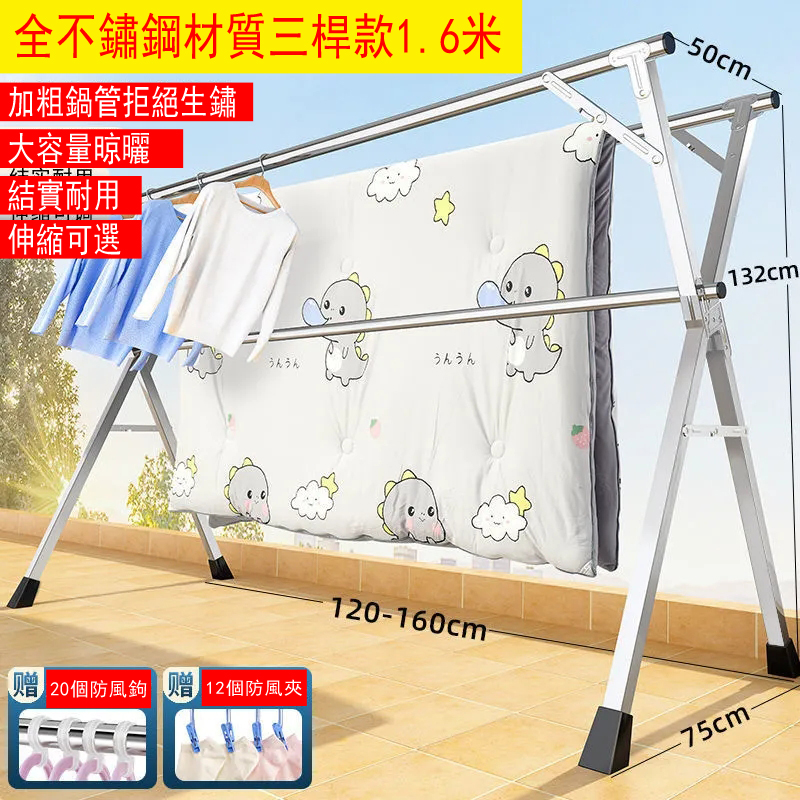 2分鐘前【下單即送20個防風掛鉤】不鏽鋼免安裝折疊家用伸縮式晾衣架 - 2025升級鞋架款1.6米 【可伸縮-送20個防風鉤+12個防風夾】NT$1890