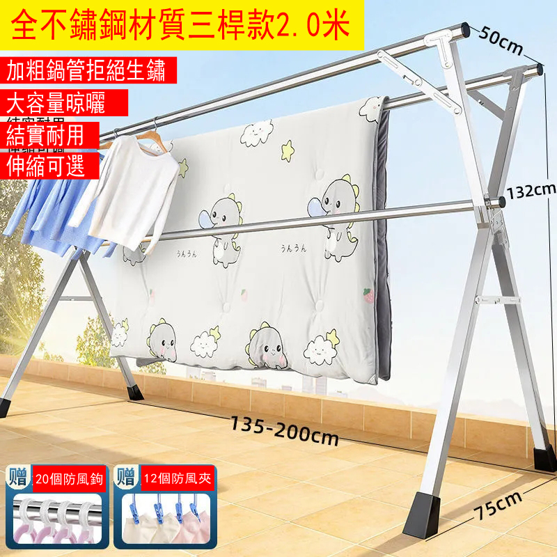 7分鐘前【下單即送20個防風掛鉤】不鏽鋼免安裝折疊家用伸縮式晾衣架 - 2025升級鞋架款2.0米 【可伸縮-送20個防風鉤+12個防風夾】NT$1990