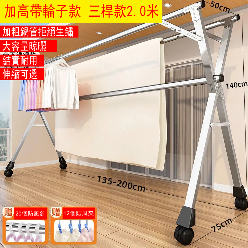 5分鐘前【下單即送20個防風掛鉤】不鏽鋼免安裝折疊家用伸縮式晾衣架 - 2025升級款加萬向輪2.0米【可伸縮-送20個防風鉤+12個防風夾】 NT$1890
