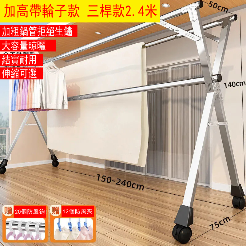 5分鐘前【下單即送20個防風掛鉤】不鏽鋼免安裝折疊家用伸縮式晾衣架 - 2025升級款加萬向輪2.4米【可伸縮-送20個防風鉤+12個防風夾】 NT$1990