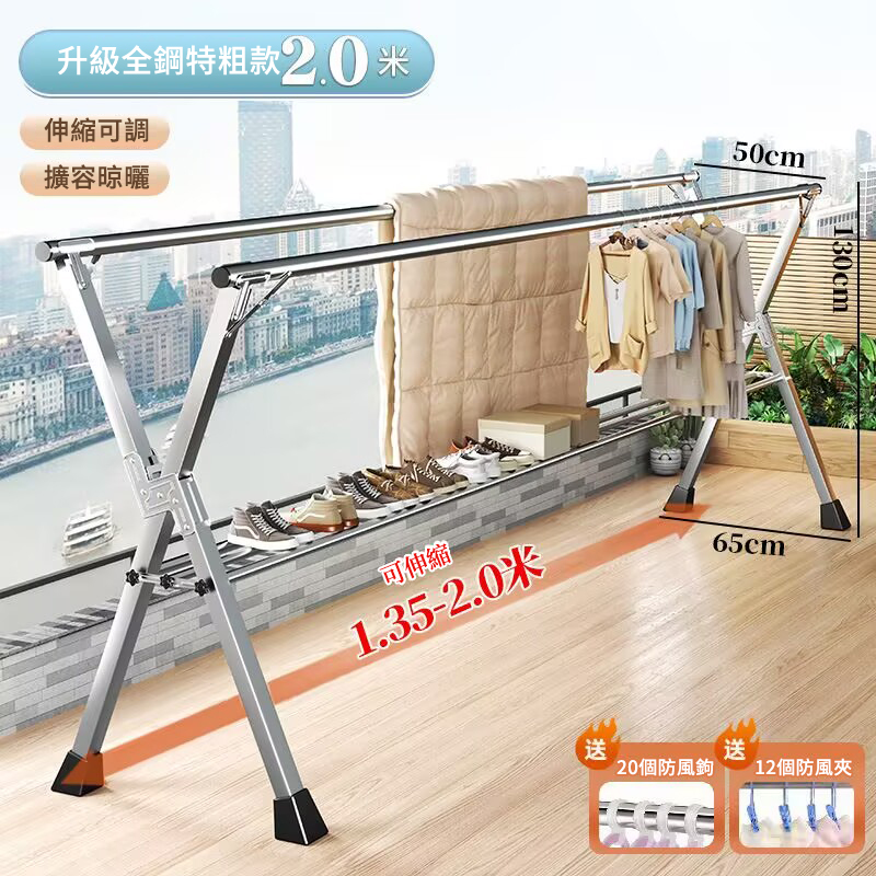 12分鐘前【下單即送20個防風掛鉤】不鏽鋼免安裝折疊家用伸縮式晾衣架 - 2025升級鞋架款2.0米 【可伸縮-送20個防風鉤+12個防風夾】NT$1990