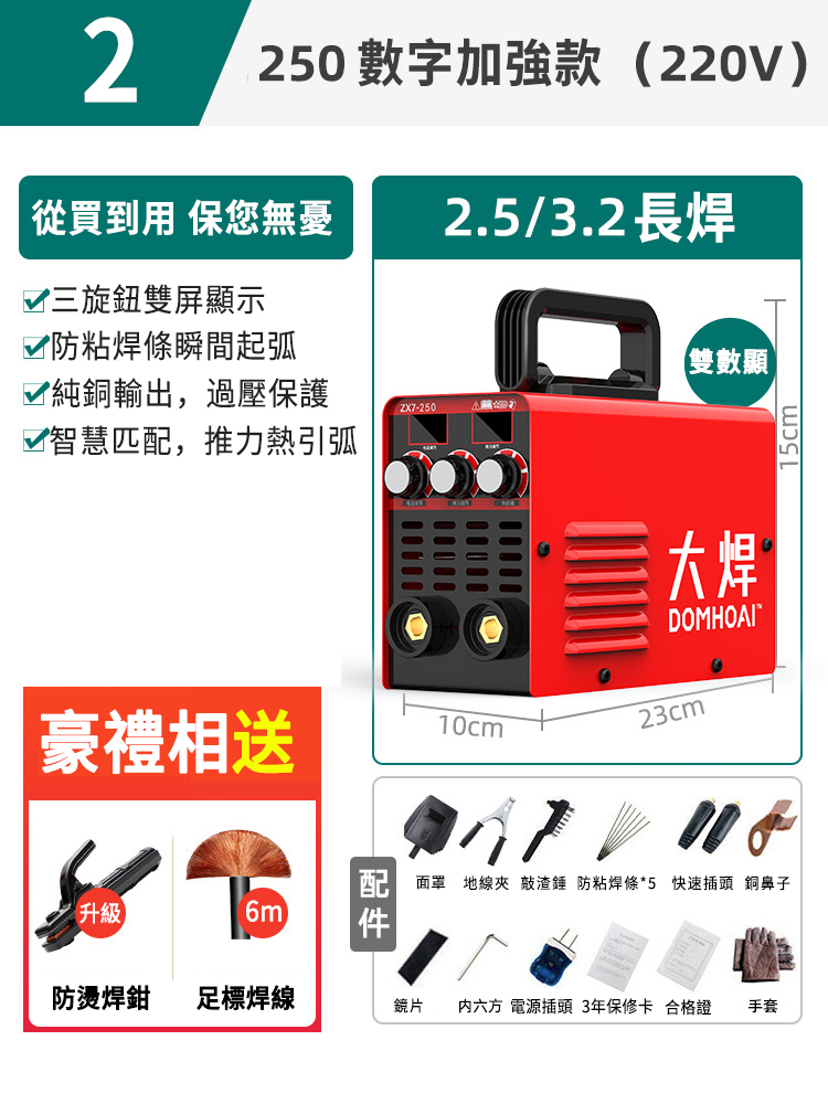 25分鐘前業內焊機領軍品牌【德國DOMHOAI】全新二代數字化電焊機,瞬間起弧,長焊4.0焊條 - 【250-220V】數字加強款+防燙焊鉗+6米焊線+大禮包