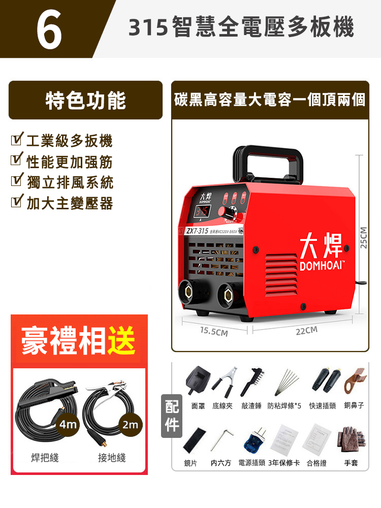 4分鐘前業內焊機領軍品牌【德國DOMHOAI】全新二代數字化電焊機,瞬間起弧,長焊4.0焊條 - 【315-220V/380V】智慧全電壓多板機+2米接地線+4米焊把線+大禮包